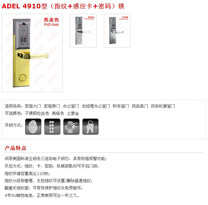 ADEL 4910型(指纹+感应卡+密码)锁 四合一