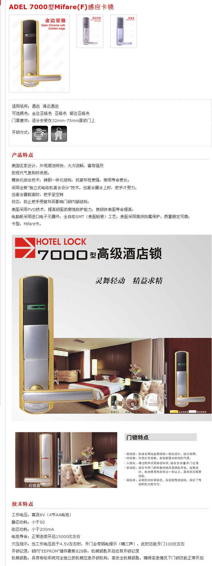 ADEL 7000型Mifare(F)感应卡锁 酒店门锁