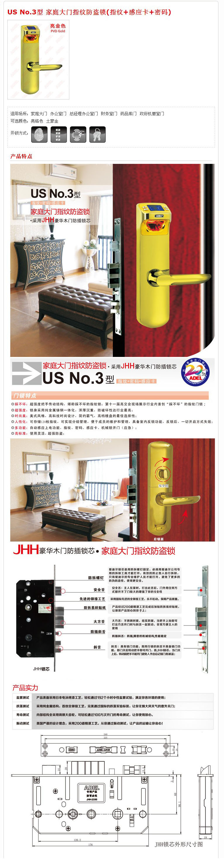 US No.3型 (美国三号)家庭大门指纹防盗锁(指纹+感应卡+密码)
