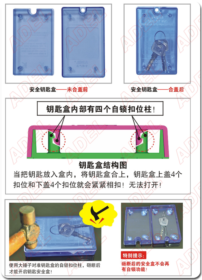 15、贴心的机械钥匙安全盒设计,****程度的****钥匙到你手中时未被复制过:产品从出厂到消费者手上,要经过代理商、建筑商、小区物业管理人员、装修公司......请问你手中的钥匙还安全码?